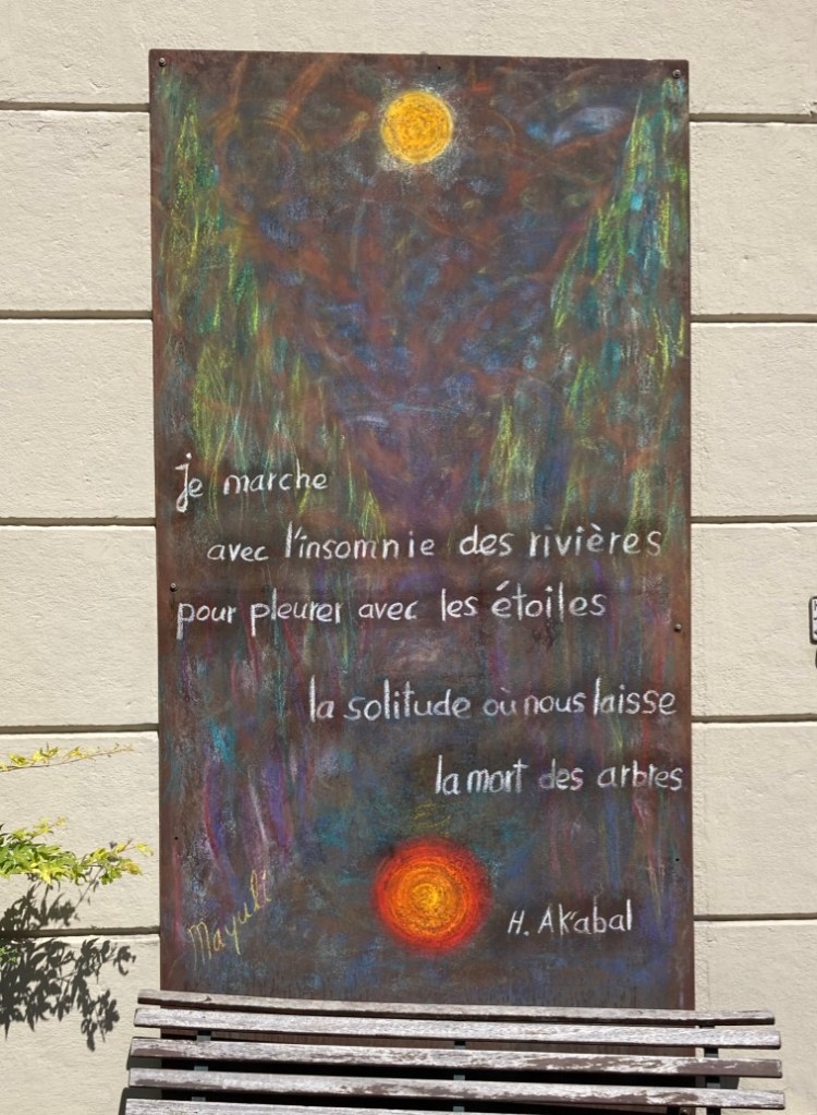 Loin des terres dures et arides assommées par le soleil du Sud, elle jouit, stupéfaite, de cet oasis de verdure. Elle qui a souffert dans sa chair de la chaleur insiste émue : l’ombre est une protection, une maison si essentielle. Elle nous raconte alors La arboleda perdida de Rafael Alberti. (Yves Tissot)