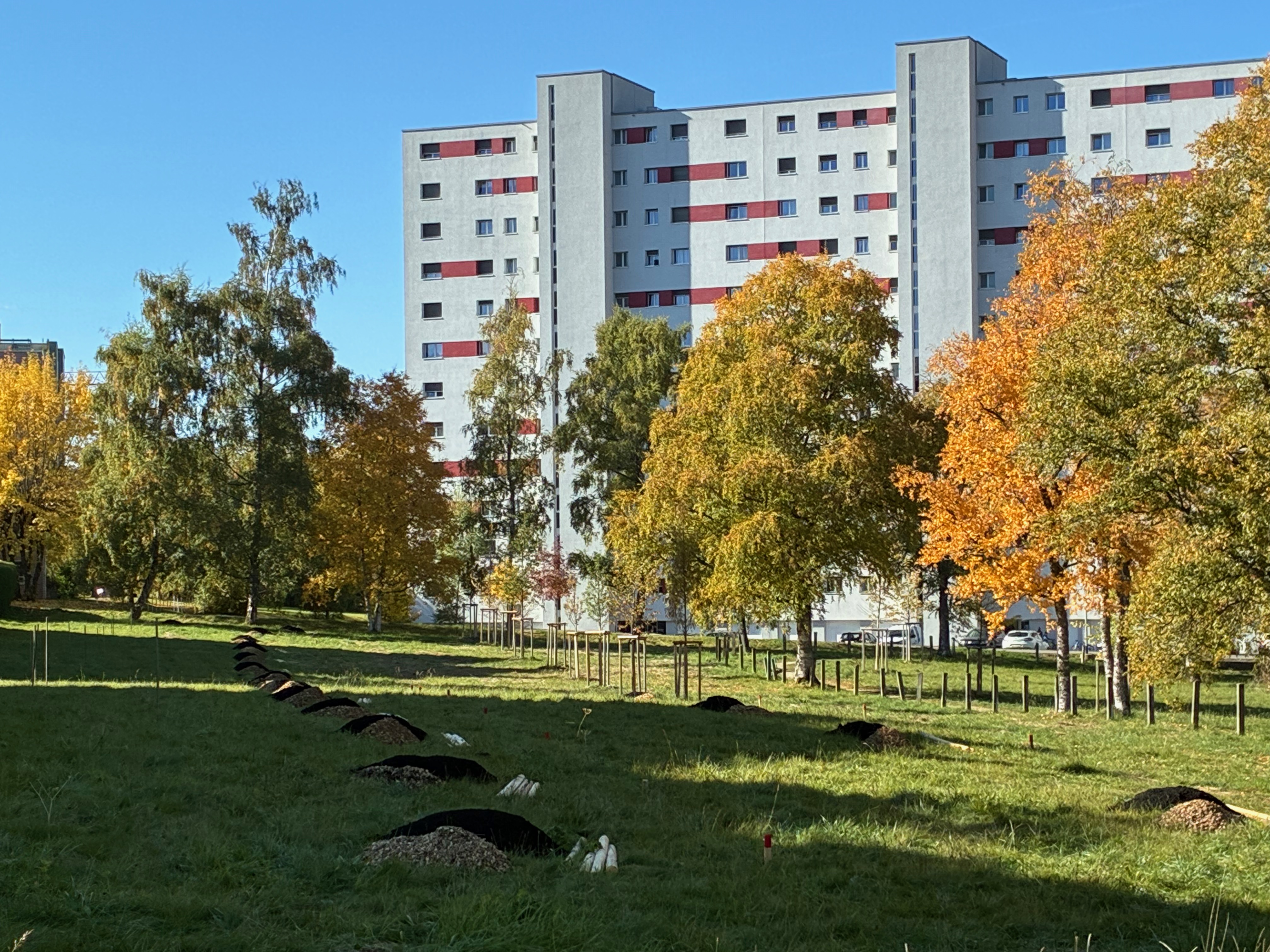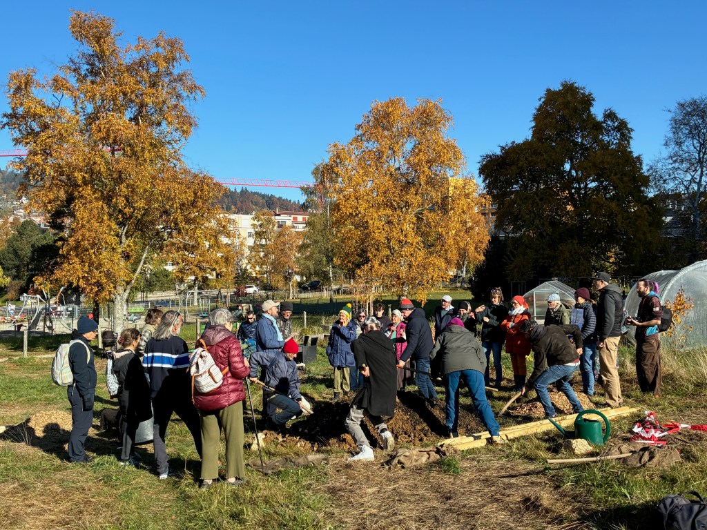 Samedi 18 octobre 2025, par une splendide matinée d’automne, a été inaugurée en présence d’une quarantaine de personnes la forêt comestible du parc du Paddock. Sous l’impulsion des Jardins du Mycélium en partenariat avec la Ville de La Chaux-de-Fonds, il y a l’idée extraordinaire de pouvoir nourrir en partie la ville grâce notamment à des arbres fruitiers et des plantes. Notre association participe amicalement et symboliquement à cette action en finançant la plantation de trois arbres. Le premier, un tilleul, arbre de notre logo, a été planté ce samedi.
